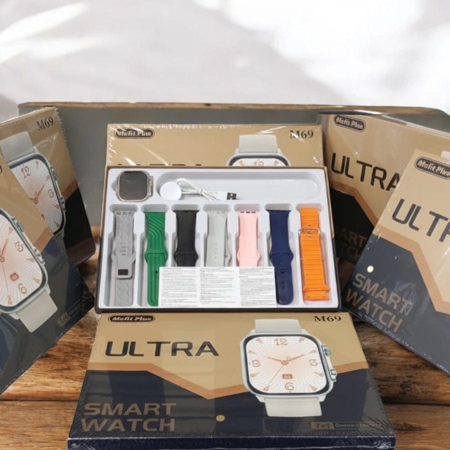 Elevate your wristwear with the Mefit Plus M69 ULTRA Smart Watch, a versatile and feature-packed wearable designed for every part of your life. This exclusive 7-in-1 bundle provides unparalleled value, including the advanced smartwatch and a collection of seven different straps, allowing you to seamlessly transition from the gym to the office and beyond.